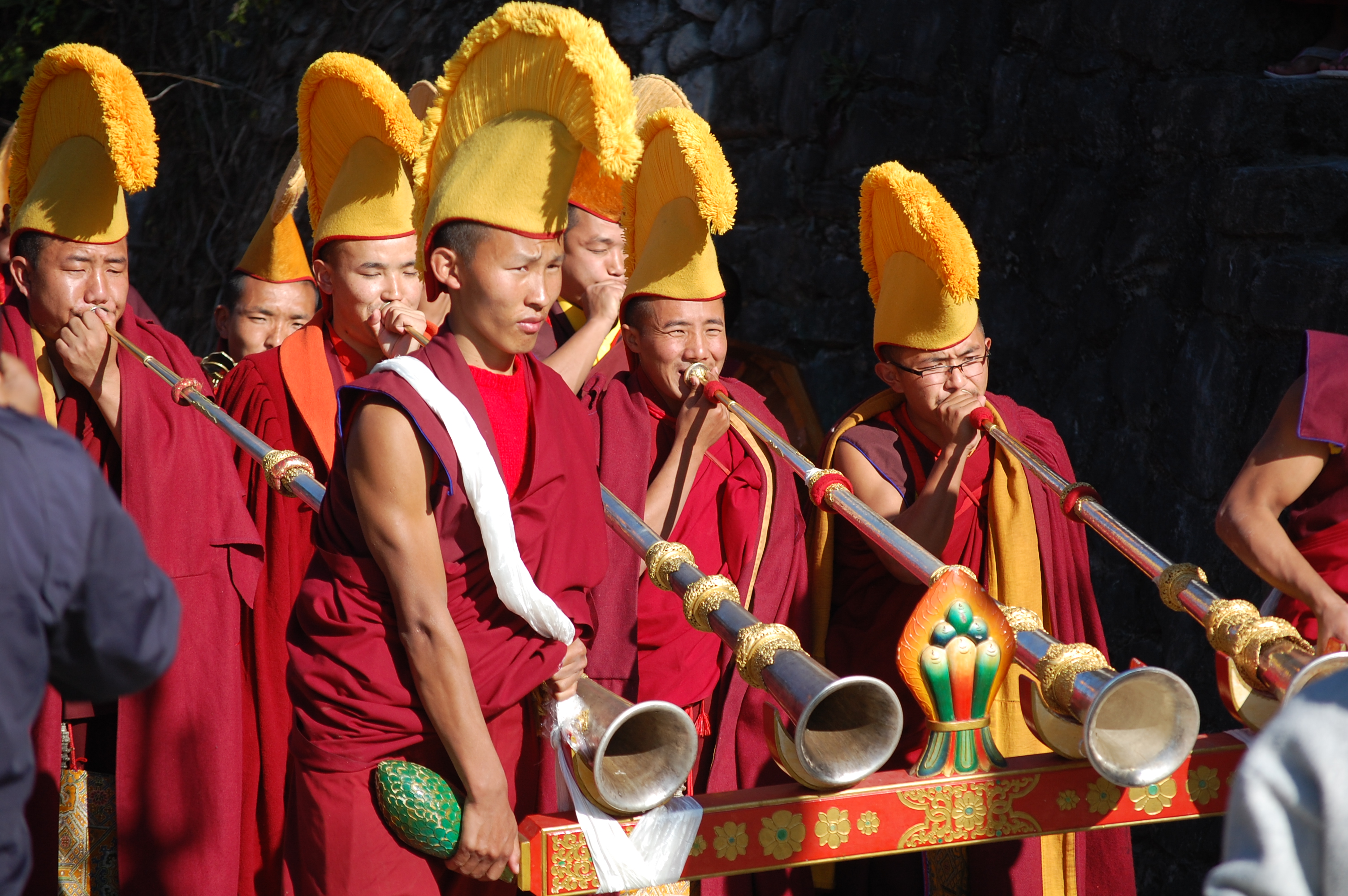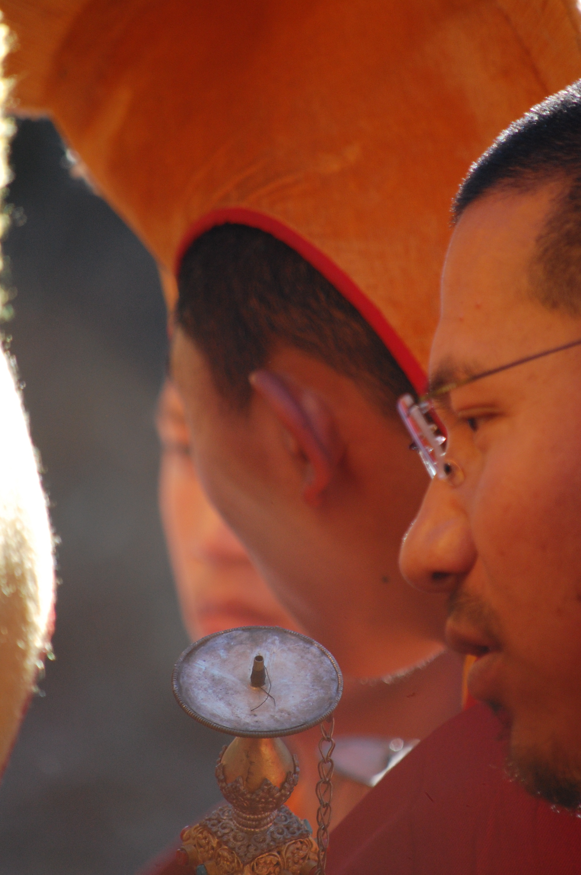 At the moment, all of the retreatants are alone in their rooms doing chöd practice. Imagine the sound of 34 men each proceeding – with no synchronicity whatsoever – through cycles of chanting, ringing bells and rattling two-sided hand drums the size of inside-out melons. Periodically the air is pierced by the slow, shrill howl of a kangling (tib. ཀང་རླིང་), which is a horn made from human thigh bone.